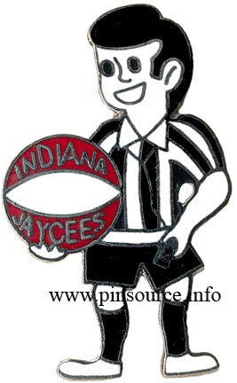 | IN8609 | IN | 1986 | Corps | Black-Medium-Enamel | 1" REFEREE HOLDING RED, WHITE & BLUE BASKETBALL - "HOOSIER CORP." | Normal | Silver Metal |